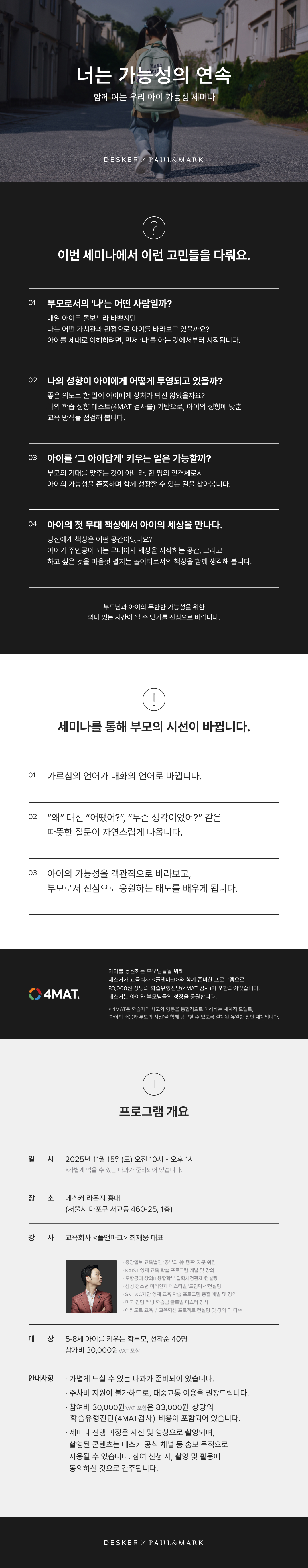 ✔ 해당 세미나는 5-8세 부모를 대상으로 진행되며, 아이 동반 참여가 불가합니다.